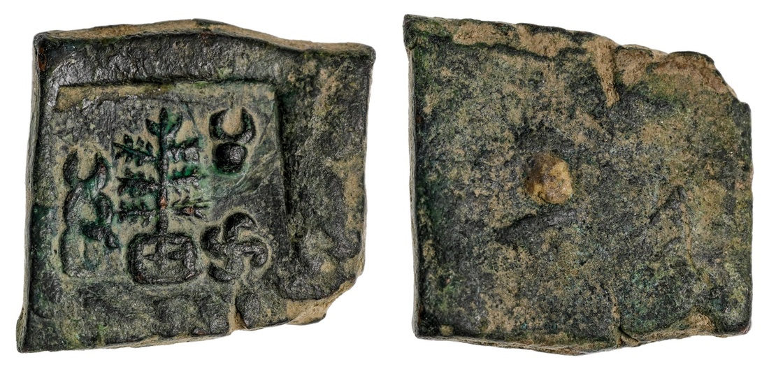 Ancient India. Post Mauryan. Taxila. AE Unit, ca. 220-185 BC. Rectangular, 7.57 gms. Hill, tree, horned symbol above swastika. AICR 1064, HGC 12, 780. Choice Very Fine.