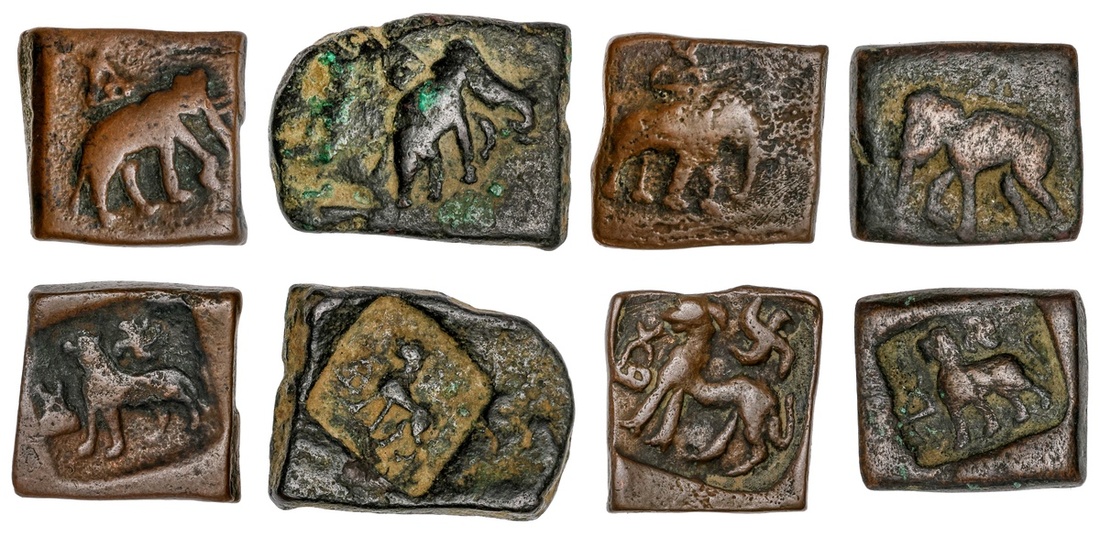 Ancient India. Post Mauryan. Taxila. Lot of AE square Units, Second-First Century BC. 6.4 to 10.9 gms. Elephant standing right (3), standing left (1), hill symbol above, rev. Lion standing left, swastika above, hill symbol before. About VF-VF. (4)
