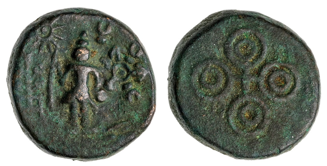Ancient India. Ujjain. AE Round Unit, 2nd-1st Century BC. 7.59 gms. Shiva standing, holding danda and kamandalu, railed tree and sun at left, six-armed symbol at right, rev. Ujjain symbol. Pieper 268. Rare. Olive-green earthen hues. About VF.