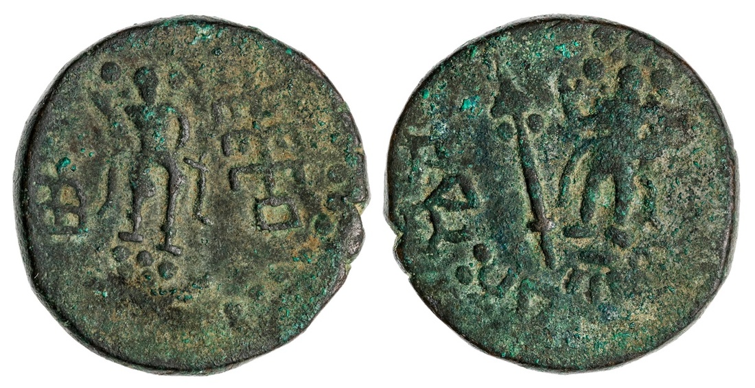 Yaudheya. AE Unit, 1st Century AD. 9.33 gms. Small six-headed Karttikeya, spear at left, Brahmi legend, rev. Small figure of Shashti standing between railed tree and hill symbol. Pieper 1607var. Very rare. Olive green with earthen hues. Very Fine.