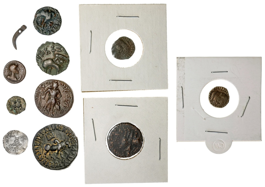 Ancient India. Lot. Includes: Indo-Scythian, Azes II AE Hexachalkon - humped bull / Lion. Choice VF; Yaudheya. AE. Karttikeya/Devasena. Extremely Fine; Kushan AEs (3), including an AE Drachm of Vima Takto (Fine); Satavahana. Sri Satakarni. Potin Unit. Elephant right. Extremely Fine; Jammu, Billon Drachm of the satrap Rajuvula (2); Western Satraps, AR Drachm of Chashtana, small Kashmir-Smast AE; and a very small possibly unrelated AE horn amulet. Fine-EF. (11)