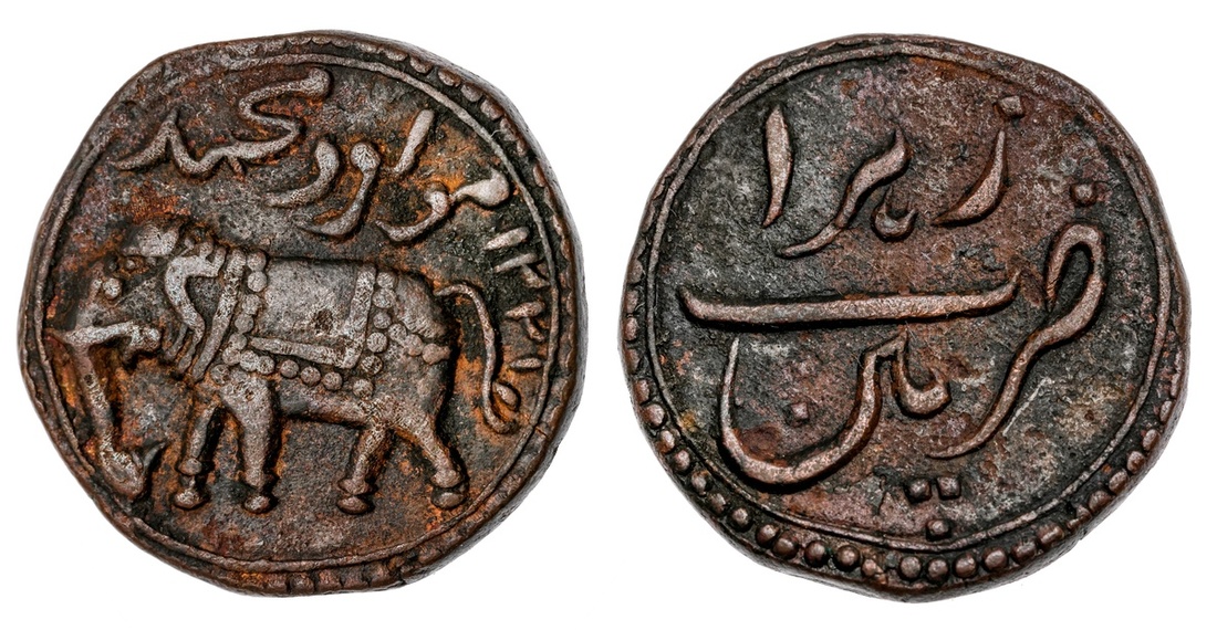 Mysore. Tipu Sultan (AH 1197-1202, AM 1215-1227 / 1782-1799 AD). Paisa, Patan, AH 1221. Elephant left, legend and date above, rev. Mint legend. KM 123.2. Good Very Fine.