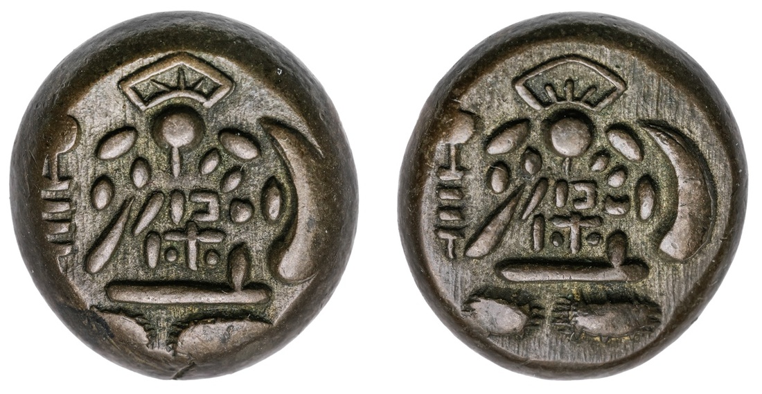 Japan. Shogunate. AR Mameita Gin ("Bean Money"). 7.3 gms. Tempo, 1837-1858. "God of Plenty" (Daikoku) both sides with era designator on belly. C.8a.3a. Charcoal gray tone. Extremely Fine.