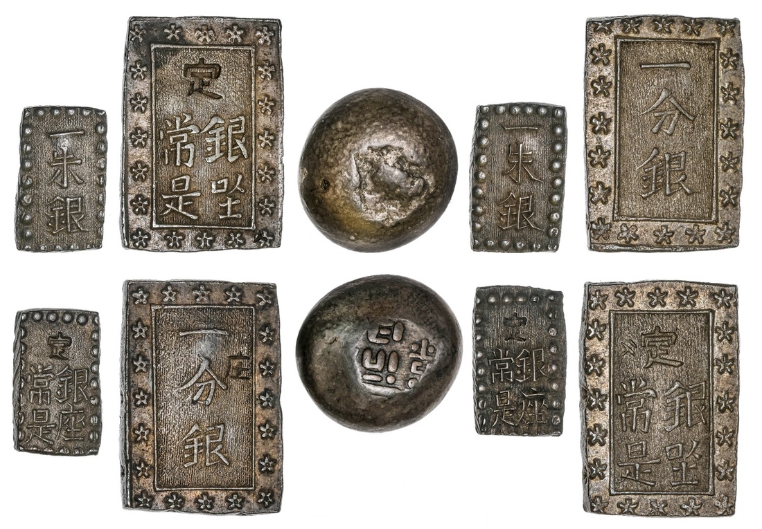 Japan. Shogunate. Group of hammered silver issues. Bu (2). Tempo, 1837-1854. C.16; Shu (2). Kaie and Meiji. C.12, 12a; and Mameita gin "bean". 9.49 gms. No God of Plenty designator. VF-EF. (5)