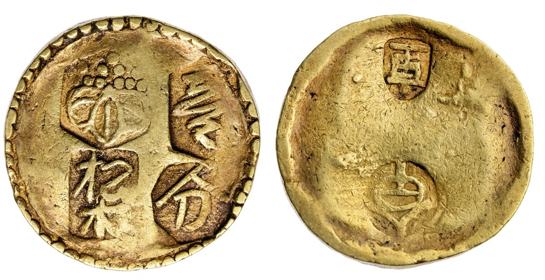 Japan. Koshu Province. Gold Ichibu-kin. 3.70 gms. Issue of the Matsuki Clan, ca. 1582-1590. Paulownia flower and three Hanji characters, rev. Two Hanji characters. Hartill Japanese 8.69, JNDA 09-88, KM 94. Rare. Toned. About Very Fine.