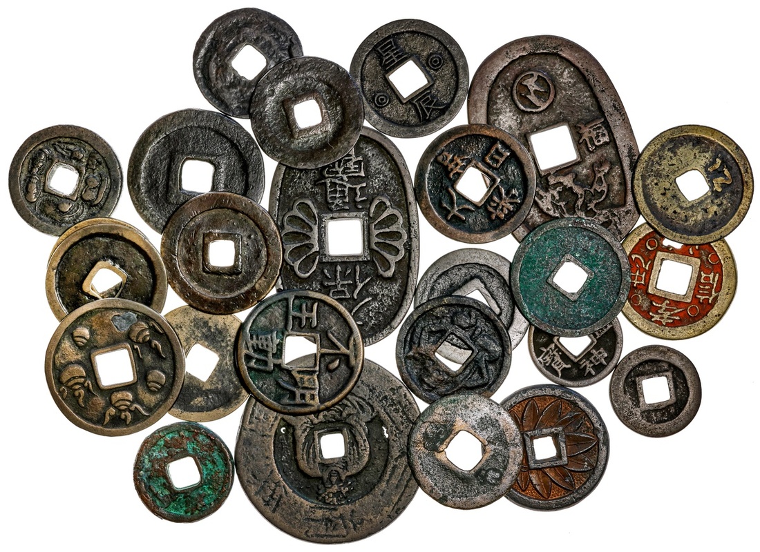 Japan. 19th-early 20th Century. Lot of AE Esen. Small - ca. 1 Mon size (14), 100 Mon shape (2), 39mm -Daikoku, Ebisu, nenbutsu-sen, Shichifukujin, money pulling horse, etc; also small Korean charms (2, one holed), Chinese and stray Cash (5). About Fine-EF. (25)