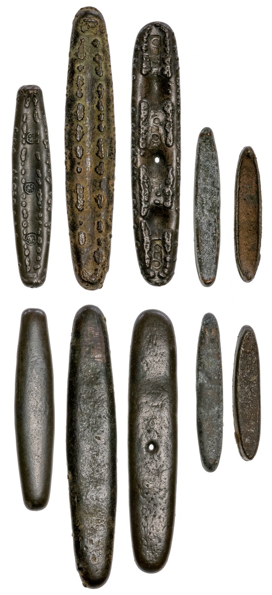 Thailand. 1591-1800s. Trio of Tiger Tongue Lats. Silver. 1 Tamlung, 54.9 gms. Three wheel stamps; Debased Silver. 1 ½ Tamlung, 92.2 gms. Three snake stamps. Small central hole; Billon. 2 Tamlung, 107.6 gms. No symbols. VF; also 2 small "Canoe" ("Boat Money") Lats from Laos. (5)