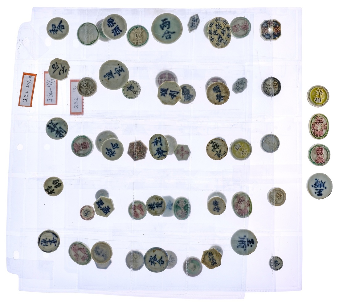 Thailand. 19th Century. Porcelain Gaming Tokens (80). Generally round with Chinese characters; a few other shapes, with Thai letters or pictorial. VF-EF. (80)
