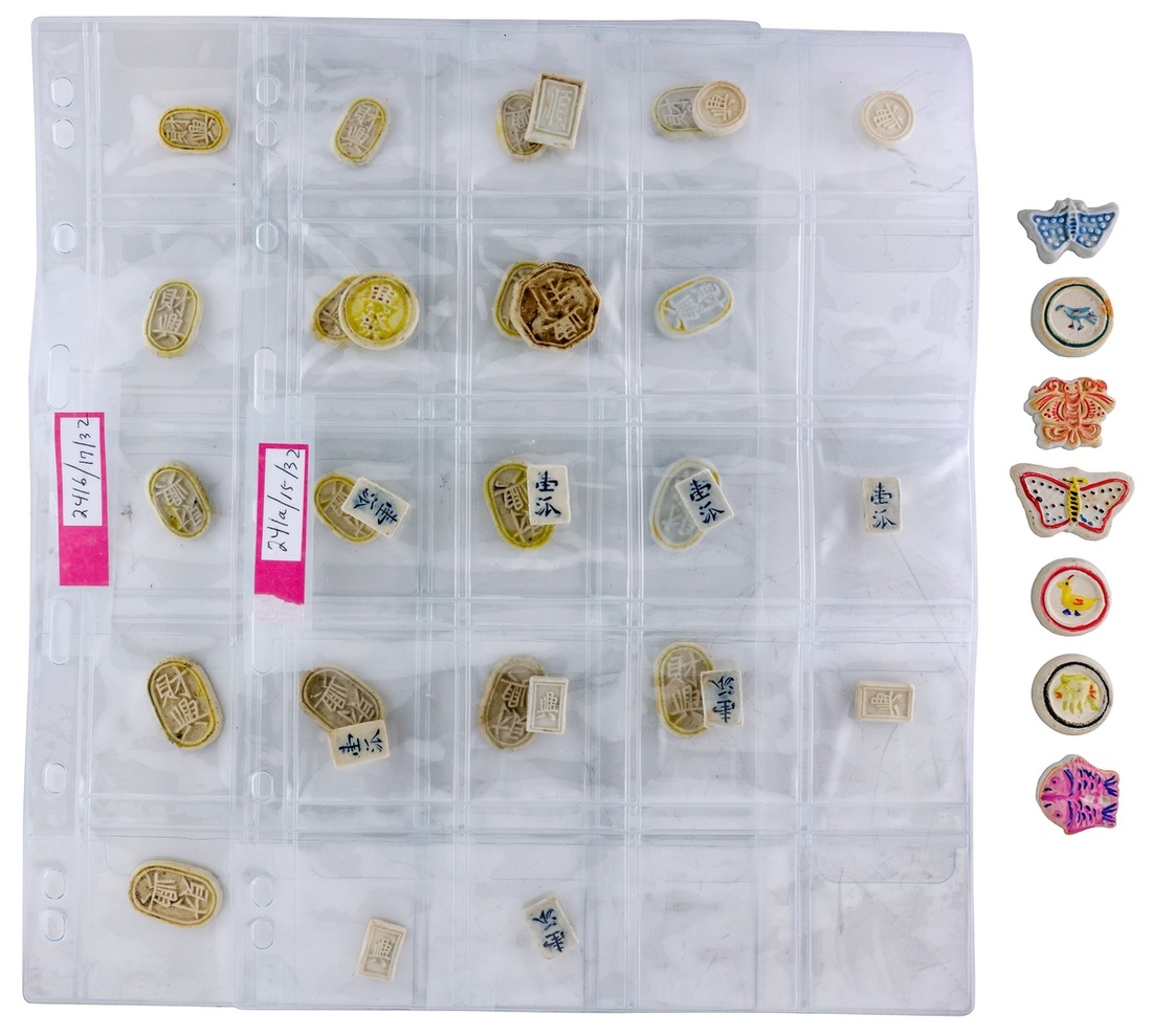 Thailand. 19th Century. Porcelain Gaming Tokens (32). Generally oval or rectangular and Chinese characters; VF-EF; also modern souvenir gaming tokens (7) - butterflies, duck, fish, bird. (39)