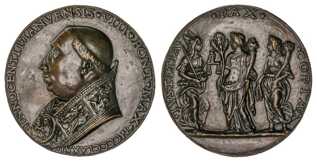 Innocent VIII (1484-1492) -- Giovanni Battista Cibo. Medal, cast, Florence 1485. Bronze, 82mm. INNOCENTII.IANVENSIS.VIII.PONT.MAX.MCCCCLXXXIV, Capped bust left wearing cope with ornate orphrey decorated with scenes from the life of Christ, rev. IVSTITIA. .PAX. .COPIA., allegory of Justice, Peace and Abundance. Hill 927. Innocent VIII is known for launching - at the instigation of German Inquisitor Heinrich Kramer -- a persecution of those accused of witchcraft, having the dubious distinction of confirming Tomas de Torquemada as Spain's Grand Inquisitor, institutionalizing simony at the papal court, and offering Charles VIII of France the kingdom of Naples in 1489 after excommunicating and deposing Ferdinando I d'Aragona (because the Neapolitan king refused to pay his feudal dues to the papacy). Although Innocent settled his quarrel with Ferdinando, and revoked the bans before his death, his initial offer to Charles led to the ruinous Italian War of 1494-1495. Rich glossy coffee-brown patina. Extremely Fine.