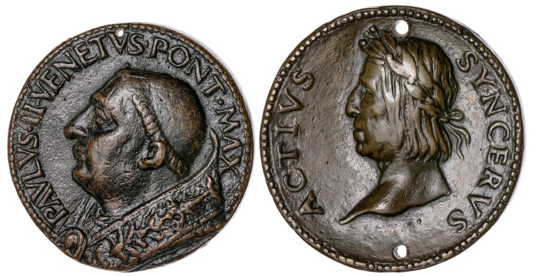 Pope Paul II (1464-1471) - Pietro Barbò. Medal, date 1465. Bronze, 32.9mm. Bust left wearing cope, pearled border, rev. Barbò Arms, ensigned with the Papal tiara and crossed keys. Hill 782; Armand II, 32, 9. Pierced. Deep brown patina. A Fine contemporary cast.