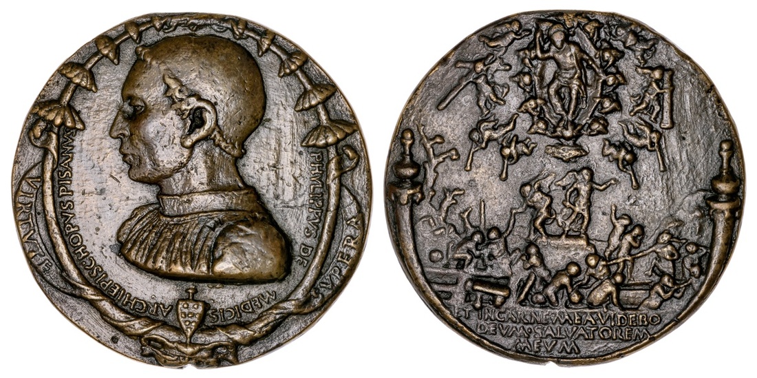 Filippo de'Medici (1426-1474), Archbishop of Pisa 1462. Medal [?], Florence 1468/9. Bronzed White Metal, 56mm. Tonsured bust in profile left, wearing rochet, within a wreath (Solomon's Seal) which is entwined with a scroll inscribed VIRTVTE and SVPERA, below the bust: PHYLIPPVS DE MEDICIS ARCHIEPISCHOPVS PISANVS; rev. The Last Judgement and Resurrection of the Dead: Christ at the upper center, angels around sounding the Last Trumpet, as the dead rise below - the Blessed on the left, the Damned on the right; in ex: ET INCARNE.MEA.VIDEBO.DEVM. SALVATOREM.MEVM. Armand I, 59, 33; Bargello I, 222; Hill 914, Pollard NGA 284.