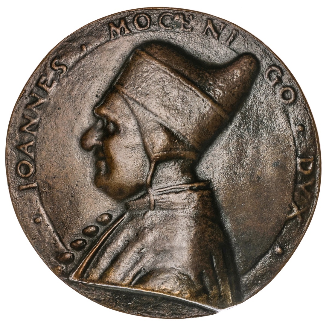 Giovanni Mocenigo (1409-1485), Doge of Venice, 1478. Medal. Uniface. Bronze, 77mm. IONNES MOCENIGO DVX, bust left wearing gown and ducal cap. Hill 436: Armand I, 57, 4. Mocenigo battled the Ottoman Sultan Mehmet II at sea and Ercole I d'Este Duke of Ferrara on land. The long war with the Sublime Porte ended in a Venetian defeat with the Treaty of Constantinople in 1479, but Venice emerged victorious in 1484 over Ferrara, recapturing Rovigo and the Polesine. A modern, but well-done cast on a reduced flan lacking a border and the GTF signature below the truncation, stamped on the edge: P.P.B.Co MUNCHEN GERMANY. Ex Michael Hall, Part II, Baldwin Sale, June 29, 2010.