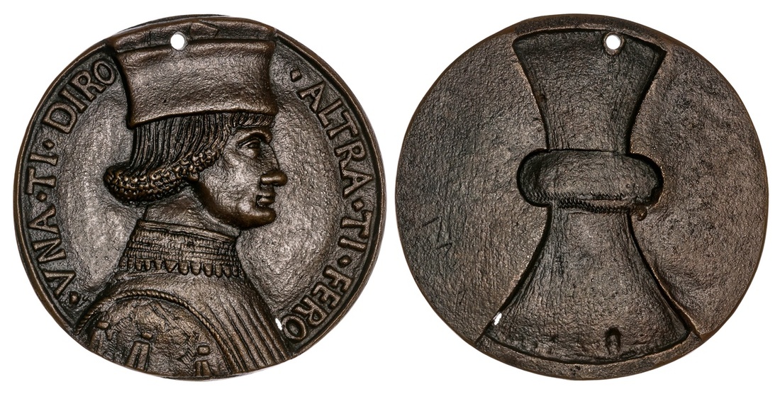 Ferry II de Lorraine (1417-1470), Comte de Vaudémont, Lord of Joinville 1458. Medal. Bronze, 72mm. ALTRA.TI.FERO.VNA.TI.DIRO, Bust right wearing a tall, wide cap, a folded noted tucked into the broad brim, rev. Incuse double-edged axe head. The legend warning the viewer that "I will tell you one thing and do another" is amplified by the double-edged axe on the reverse. Hill 137 = Pollard 73 - "only known specimen". The model for this cast is the National Gallery specimen. Although published as an unknown sitter, the portrait is that of Ferry II as can be seen by his medal by Francesco Laurana dated 1464. The tucked-in folded note is a detail that can be seen in other portraits of the period. Pierced, small casting flaw at 5:00. Extremely Fine. Ex Baldwin Sale 57-58, September 23-24, 2008, lot 799 - "seemingly a later cast, good very fine with brown patination, pierced through top fold of hat, and flaw (between O of FERO and doublet). This cast is extremely close to the Kress specimen, even to the zig-zag line through the centre of the brush."