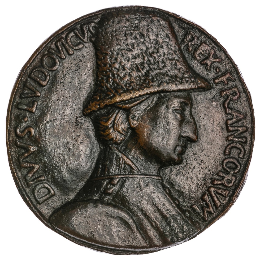 Louis XI, King of France (1423-1483). Medal, ca. 1465. Uniface, cast. Bronze, 69.5mm. Bust of the French king right wearing tall wooly hat and buttoned-down gown with collar rising at back. Deep birch brown. About Extremely Fine. Ex Luc Smolderen, Künker Sale 282, September 28, 2016, lot 4838 (part).