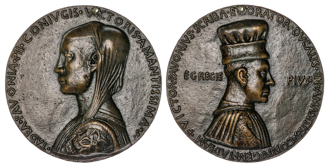Vittore & Taddea Pavoni. Medal, cast, Ferrara ca. 1463. Bronze, 88mm. Draped bust of Vittore Pavoni right in a coat with embroidered sleeves, wearing a biretta a tozzo, rev. Veiled bust of his wife, Taddea left in an embroidered gown. Armand I, S.30, 9; Börner 37, Kress-; Hill 90. Vittore Pavoni was the ducal chancellor in Ferrara at the court of Borso d'Este. Edges filed around likely due to an old frame fitting; raw edge now concealed by brown paint. Pierced. About Extremely Fine and Rare. Ex Luc Smolderen, Künker Auction 282, September 28, 2016, lot 4397.