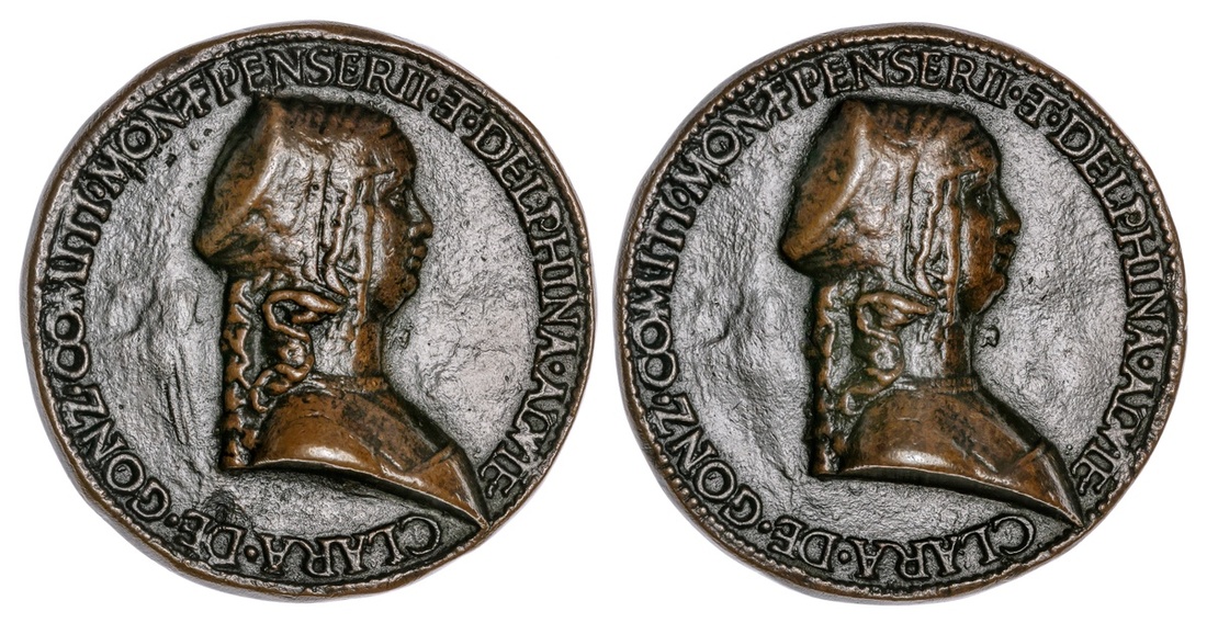 Chiara Gonzaga (1464-1503). Medal, Mantua 1496 or after. Bronze, 59mm. CLARA.DE.GONZ.COMITI.MONTPENSERII.T(reversed E).DELPHINA.ALVIE, Bust right, wearing coif over veil, rev. As obverse. cf. Hill 200; cf. Armand II, 85, 5-6; cf. Bargello I, 53; cf. Mantua V.17; cf. Magnaguti 150; cf. Johnson-Martini 333. Chiara Gonzaga was married in 1481 to Gilbert de Bourbon, Comte de Montpensier and Dauphin d'Auverne. As she wears a widow's veil here, we can date the medal to 1496 - the year of her husband's death or after. This medal is unusual and possibly unique as a double-sided portrait as only uniface specimens or those with muled/alien reverses are recorded. Very Fine.