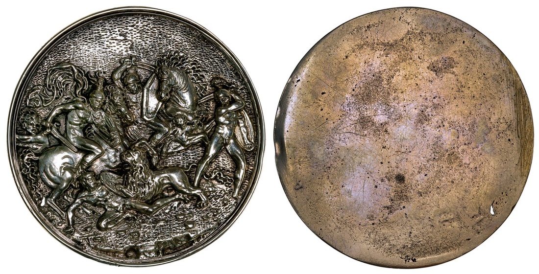 Lion Hunt. Round plaquette, Verona ca. 1504-1510. Silver, 77.8mm. On rocky ground, a naked man defends himself with his shield against an attack by a lion, two mounted warriors before raising their swords to strike the beast, while a warrior standing behind does the same. Pope Hennessy 178; Bargello 217. For other casts with stippled ground, which may suggest 17th century workmanship, vide: Bargello & Scaglia [Rossi v.40, pp. 122, tav. XXXVI]. Some scratches on the back, casting flaw at 8:00. An Extremely Fine later cast.