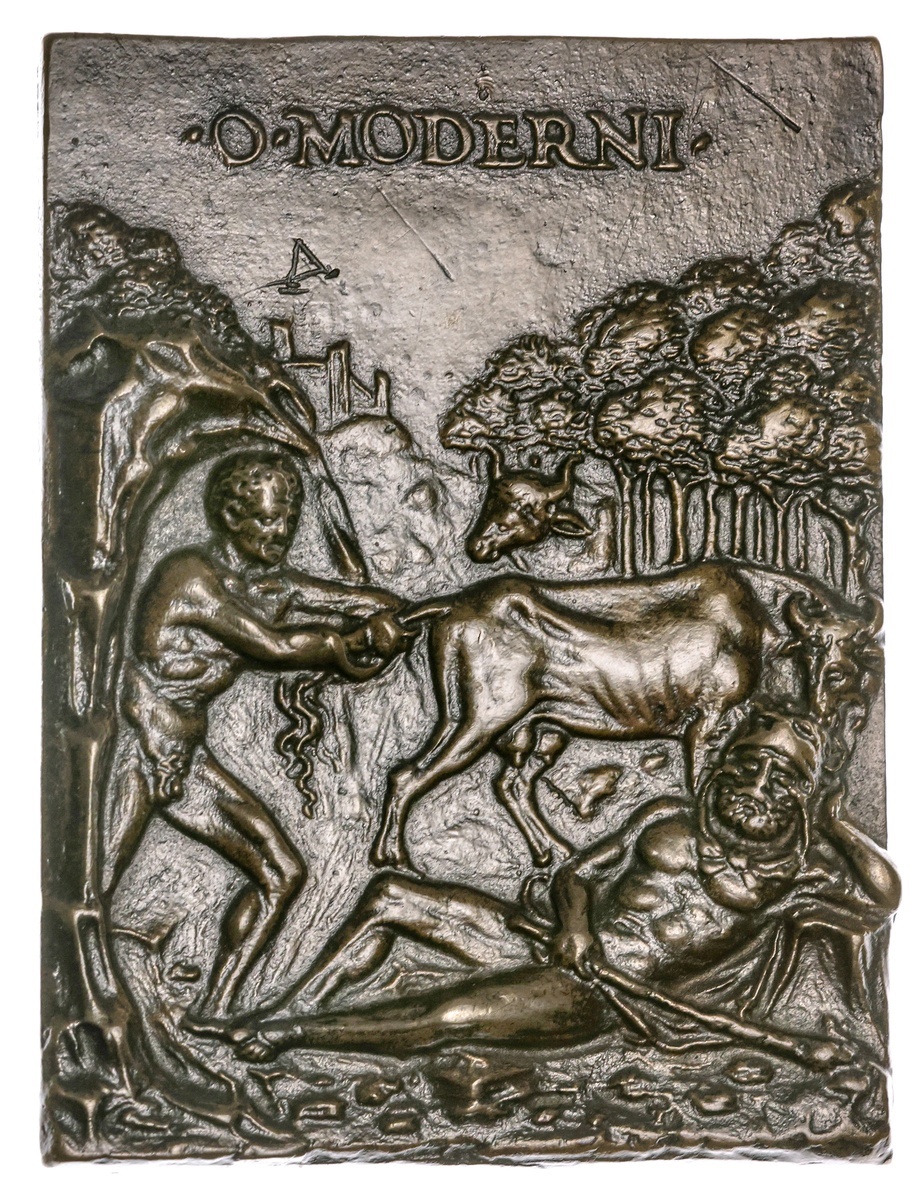 Cacus Stealing the Oxen of Hercules. Rectangular plaquette. Before 1507. Bronze, 70 x 53mm. Hercules lies asleep in the field as Cacus pulls his ox by the tail into the cave mouth, signed above .O.MODERNI. (Opus Moderni). Bargello 146. An Extremely Fine old cast. Ex Luc Smolderen, Künker Sale 282, September 28, 2016, lot 4846 (part).