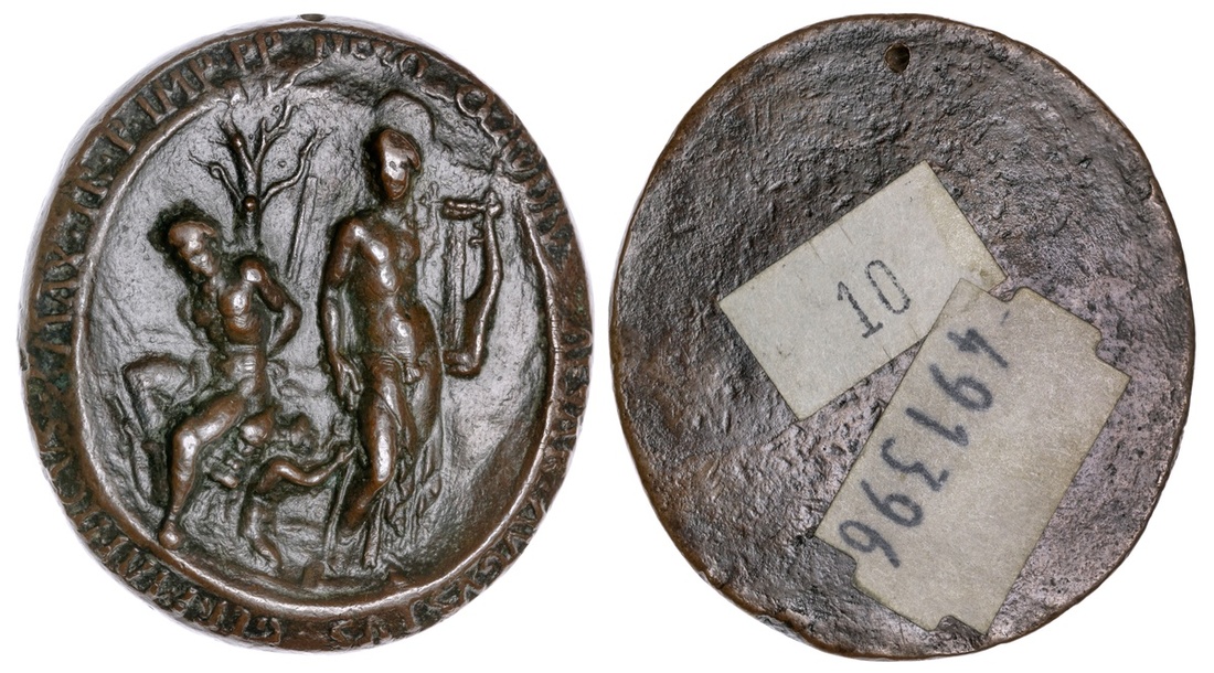 Apollo and Marsyas. Oval plaquette. Bronze, 42 x 46mm. Laureate and mantled Apollo standing at right, holding his lyre and plectrum, his head turned back to look towards Marsyas, seated left on a lion's skin, his hands tied behind his back, resting against a tree from which hangs the double tibia of Silenus; between them Olympos, the flute player, son (or pupil) of Marsyas kneels pleading to Apollo for clemency; legend around. Molinier 2 (with inscription); Bange 66-9 (after the antique); Kress 246-7 (after the antique); Oxford Ashmolean 2; Venice Museo Corner 77; Middledorf 288.
