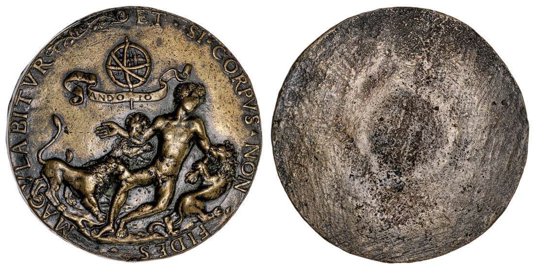 Allegory of Fidelity. Round plaquette. Bronze, 58mm. ET.SI.CORPVS.NON.FIDES.MACVLABITVR, Reclining naked youth attacked by three lions, a celestial sphere and a scroll, inscribed: AM AND IO, above. Molinier 630; Bange 527; Kress 112; Rossi 41. Cf. Attwood 303. A Very Fine old cast. Ex M&M Sale 42 (Germany), June 3, 2015, lot 639 - 400 Euros.