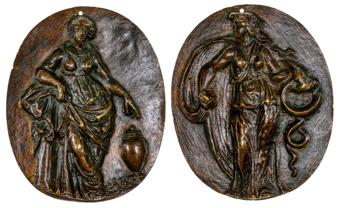 A Pair of Virtues. Oval plaquettes. Cast Bronze. 65.7 x 79.3mm and 64.9 x 79.3. Prudence. Draped Prudence, one breast exposed, stands facing, head left, holding a coiled serpent; Temperance. Draped Temperance, stands facing, leaning on a column and pointing to a jar. Apparently unpublished. From a set of Virtues. Both pierced. Rich, dark brown patina. Extremely Fine.