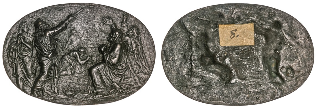 Moses and the Israelites Gathering Manna from Heaven. Oval plaquette. Bronze, 46mm x 39mm. Moses at left standing right raises his staff, robed youth beside him; before them, a man kneels left, while another to his side raises his hands to heaven, small figure between kneels right, placing an omerful of manna into a jar. Two figures in the far background are very weak as they were merely sketched into the wax and are only visible under close inspection. Calveri 65 - This Specimen. Old collector's inventory tag (no. 8) on the back. Very rare and apparently unique. A Very Fine contemporary cast. Ex Numismatica Ars Classica, November 7, 2009, lot 763.