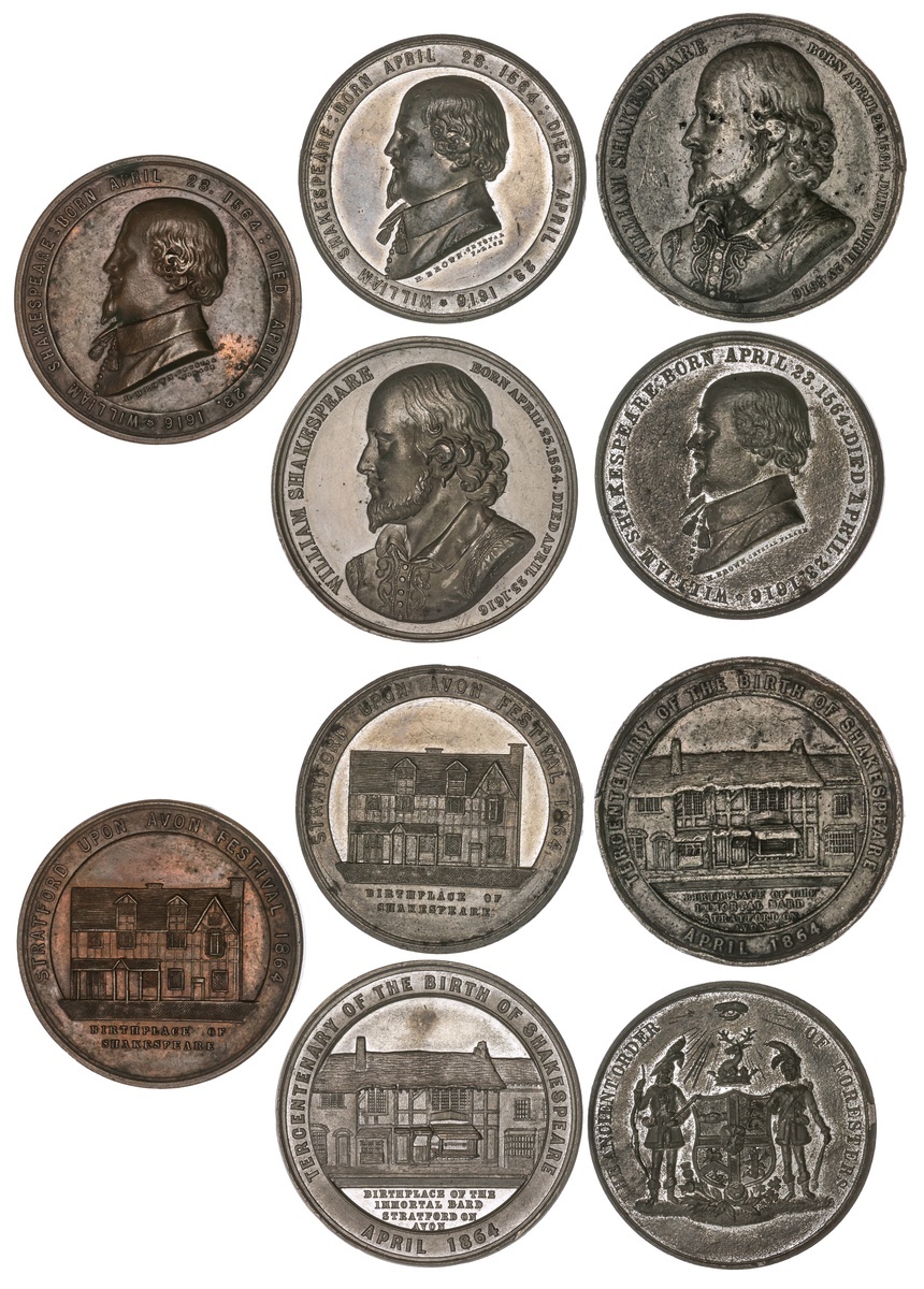 Tercentenary of Shakespeare's Birth, 1864. Lot of Medals. Bronze and White Metal, 42mm. By H. Brown. Bust left / The bard's birthplace; STRATFORD UPON AVON FESTIVAL 1864. The AE with small spot of deposits; White Metal, 44.6mm (2). Bust left / The bard's birthplace; TERCENTARY OF THE BIRTH OF SHAKESPEARE. One with small surface digs and scratches; White Metal, 42mm. By H. Brown. Bust left / The Ancient Order of Foresters, supported Arms. Wood, 42mm. Uniface. Bust left, vital dates in legend; white Metal, 44mm. Facing bust, vital dates in legend / View of Shakespeare's House, Stratford. Hairlines in fields; White Metal, 39mm. Types similar to last, shorter reverse legend. Holed for suspension; Copper, 23.5mm. By W.J. Taylor. Bust left / Birthplace of Shakespeare. VF-EF. (9)