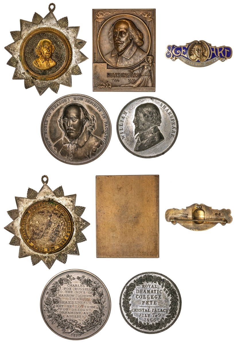 Group of mid-19th to early 20th Century Shakespeare Medals. Tercentenary of Birth. Gilt Brass shell medallion in a White Metal multi-rayed star, 52mm. Bust ¾ right / The bard's birthplace. Some reverse stain; White Metal, 38mm. Bust left / Royal Dramatic College Fete, Crystal palace July 7 & 9 1866 legend within wreath; Silver, 43.6mm. Harrow School Shakespeare Prize Medal. Bust ¾ left / Ten-line legend "Charles Fox Russell to the" etc within wreath, date 1870 below. Awarded to (edge): K.C. GANDAR-DOWER 1927; 1901 Shakespeare Festival Steward's badge. Silver and enamels, pinback. By Spencer, London; ca. 1908 Bronze plaquette, 39 x 51mm. Uniface. By Wilhelm Mayer and Franz Wilhelm, Stuttgart. Cameo bust 3/4 left, hooded woman (Lucrece) below, wielding knife. VF-EF. (5)