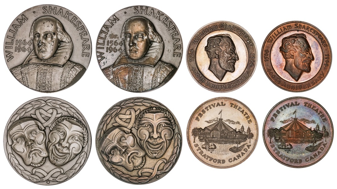 William Shakespeare, 400th Anniversary of his Birth, 1964. Quartet of Medals. Silver, 50mm (2). 71.1 and 82 gms. Bust ¾ left / Masks of Tragedy and Comedy. One Numbered 44 and SILVER (edge), the other No. 28 and hallmarked (edge); Silver (49.5 gms) and Bronze, 41mm. Wellings, Toronto. Stylized head right by Fraser / Festival Theatre, Stratford, Ontario, Canada. Uncirculated. (4)