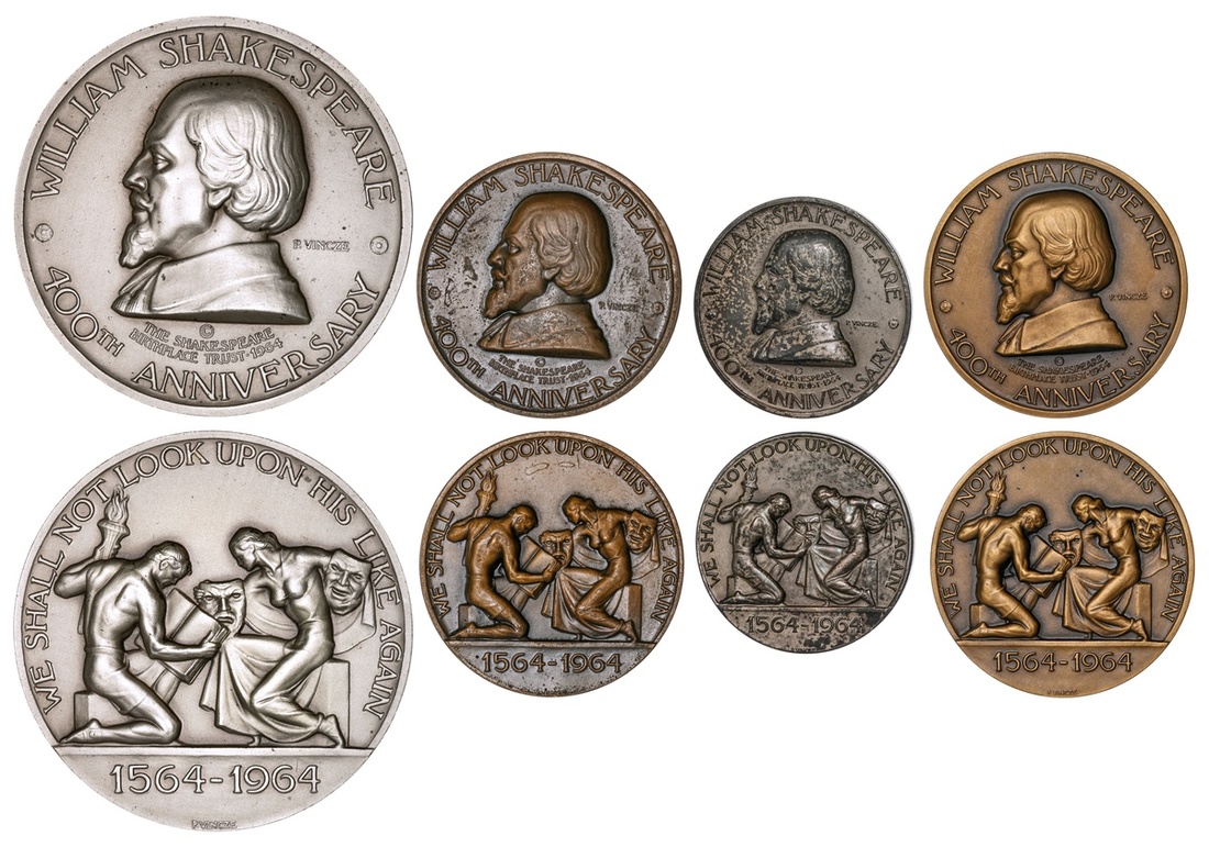 William Shakespeare, 400th Anniversary of his Birth, 1964. Sextet of Medals. Silver, 32 and 56mm. 15.7 and 85.9 gms; Bronze, 38mm (2). By P. Vincze. Bust left / Dramatic allegorical figures with masks of Comedy and Tragedy. The smaller silver, mottled tone; Uniface Medals. Silver (71.3 gms) and Bronze, 51mm. By John Pinches, London. The Immortal bard facing ¾ left. Uncirculated. (6)
