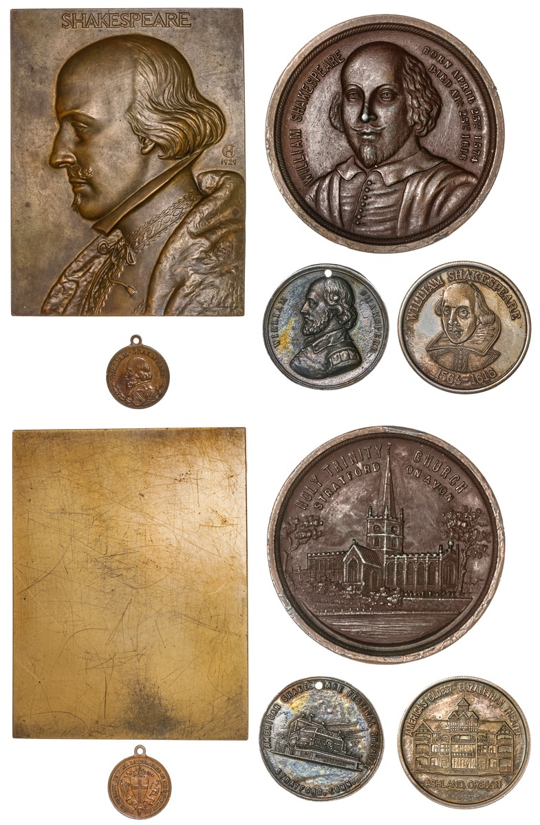Shakespeare Medals, a quintet: Bronze plaquette, 69 x 91.5mm. Uniface. By Helen H. Cutler, 1921. Bust left. Plain edge; Bronze, 70mm,11mm thick. Bust ¾ left, vital dates in legend / Holy Trinity Church; Tercentenary of his Death, 1916. Brass, 18mm. Bust left / Arms. Integral loop; Modern - America's Oldest Elizabethan Theatre, Ashland Oregon. Silver, 38.9mm, Bust ¾ left / View of theatre. "1992" on edge; White Metal, 38mm. Copy of Allen and Moore 1847 obverse / American Shakespeare Festival Theatre, Stratford, Conn, view of building. VF-EF. (5)