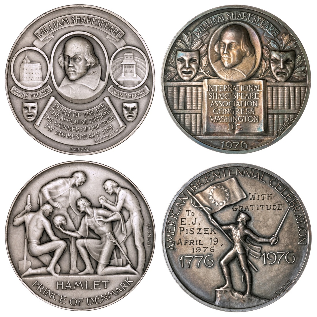 Pair of Shakespeare Medals. Shakespeare -"Soule of the Age". Silver, 55.3mm. 73.8 gms. By P. Vincze. Bust ¾ left between the Globe and Swan Theatres, masks of comedy and tragedy below / "Alas poor Yorick" scene from Hamlet; and International Shakespeare Association Congress, Washington D.C. 1976. Presentation Medal. Silver, 55mm. 69 gms. Cameo of the Immortal Bard between masks of comedy and tragedy / American Bicentennial. Engraved "To E.J. Piszek with Gratitude April 19, 1976". With original presentation case. Extremely Fine. (2)