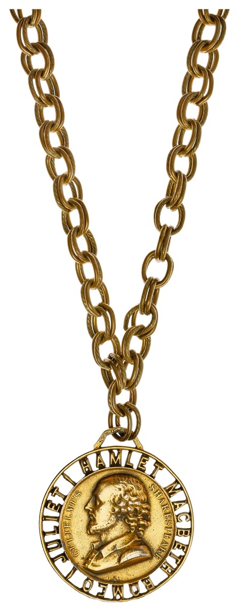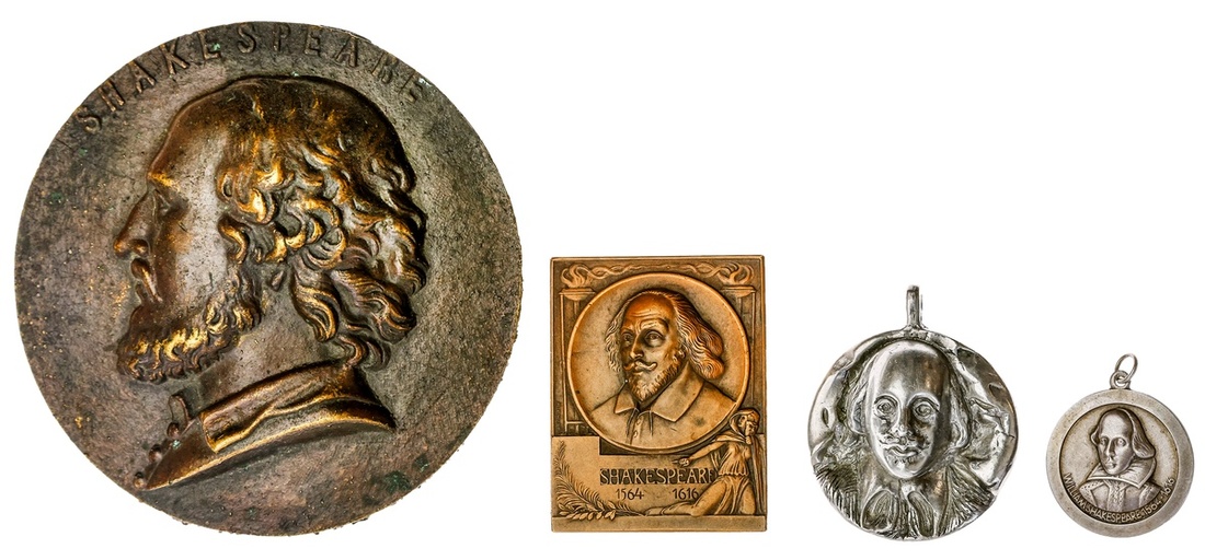 Group of Medallic Items depicting Shakespeare. Bronze Plaque (1908), 39 x 51mm. By Wilhelm Mayer & Franz Wilhelm, Stuttgart. Cameo bust ¾ left, vital dates and hooded woman with dagger below; Uniface Bronze, 94mm. Bust left; Uniface Silver (.925), 27.3mm. The Immortal Bard facing ¾ left, vital dates below. Integral loop; Uniface WM, 39mm. "Blow out facing bust", hallmark RB on reverse; Gilt AE Medallion, 53mm, cast. Bust left, outer openwork naming plays - "Hamlet, Macbeth, Romeo (&) Juliet" / Vital dates in Latin, Roman date 1818 below. On link chain. Extremely Fine. (5)
