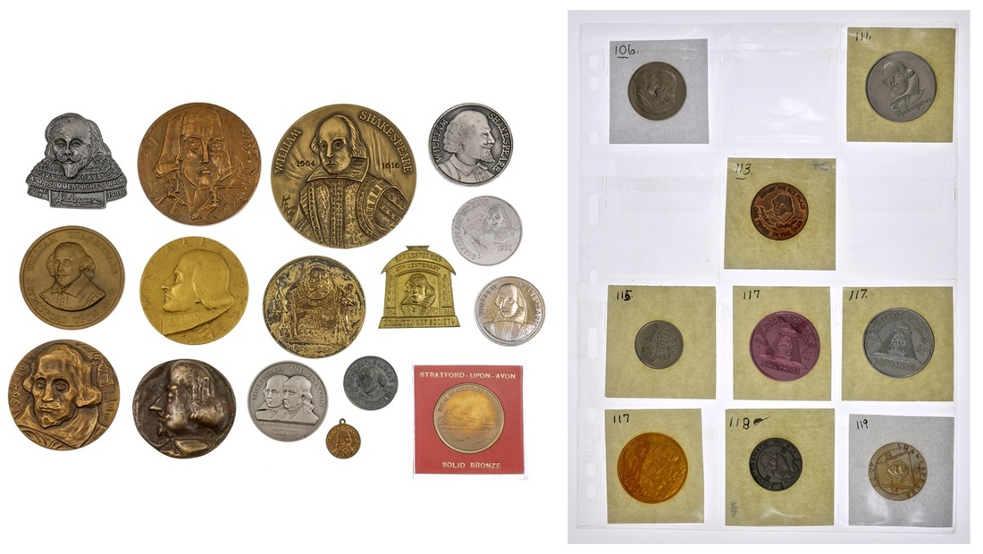 Lot of modern medals and tokens related to Shakespeare. Includes: 200th Anniversary of the Stratford Jubilee. Silver gilt, 58mm. By P. Vincze. Tarnished; large AEs - 80mm, 68mm, 60mm, (2), 57mm and 56.5mm (modernistic high-relief obverse); and various smaller medals and tokens (18) in AE, pewter, aluminum, one in silver. EF-Uncirculated. (25)