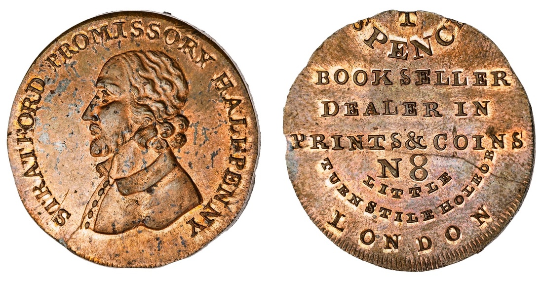 Great Britain. Warwickshire. Stratford. Spence. Halfpenny Token, undated. Shakespeare bust left, rev. T. Spence Bookseller, etc. D&H 321. Mostly red. Uncirculated. Ex Badlwin's Auctions, Sale 61, lot 336.