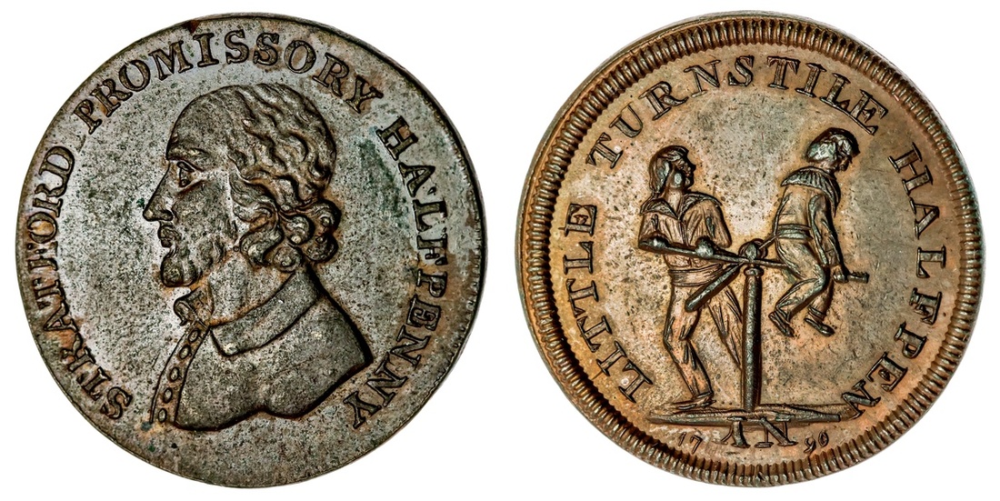 Great Britain. Warwickshire. Stratford. Spence. Halfpenny Token. Shakespeare bust left. Muled LITTLE TURNSTILE HALFPENNY 1796 reverse -- two boys on a turnstile. D&H 323. Rich coffee brown. Uncirculated. Ex Baldwin's Auctions, Sale 46, lot 2508.