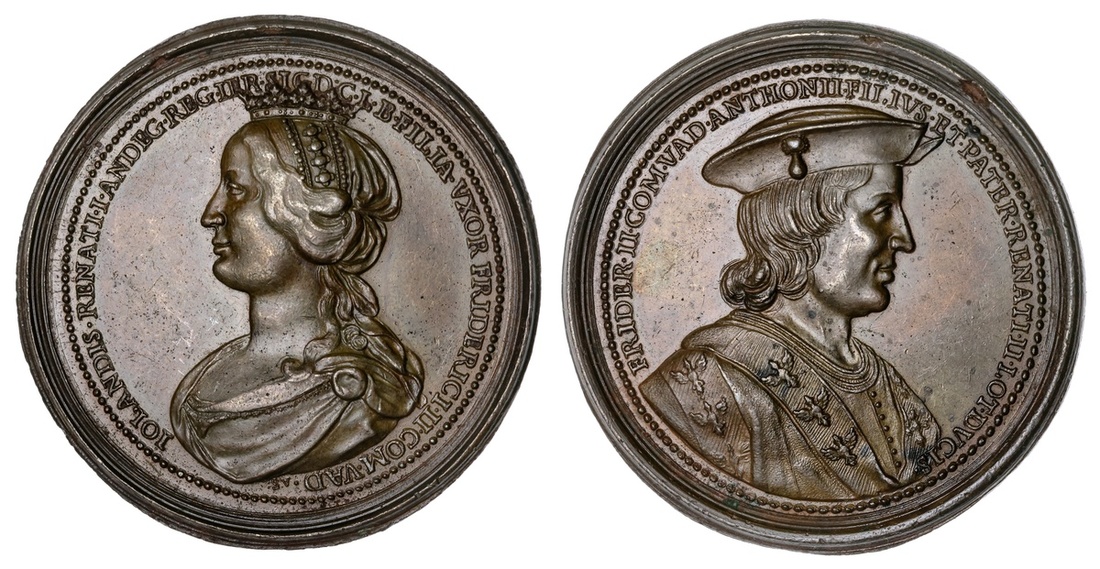 France. Lorraine. Ferry II Comte de Vaudemont and Iolande d'Anjou. Medal, ca 1720. Bronze, 47mm. Bust right of Ferry II (1428-1470), rev. Bust left of Iolande (1428-1483). From the series of the Dukes and Duchesses of Lorraine. Forrer V, p.310, 44; Mirnik 26. A few tiny dark spots. Extremely Fine.