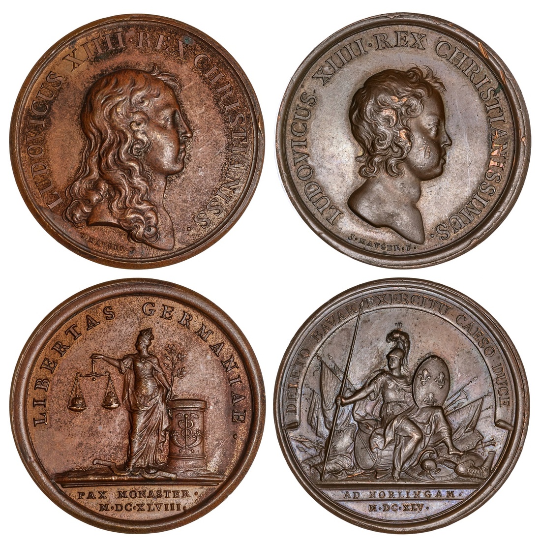France. Louis XIV (1643-1715). Pair of Thirty Years War Medals by Mauger. Both Bronze, 41mm:  Battle of Nördlingen, 1645. Young head right / France seated atop trophies, holding spear and shield. Plain edge. Small scuff on cheek; Peace of Westphalia, 1648. Later Paris mint restrike. Head right / Pax standing holding scales and olive branch by plinth adorned with a caduceus. (cornucopia) BRONZE on edge. Some thin granular dark areas. VF-EF. (2)