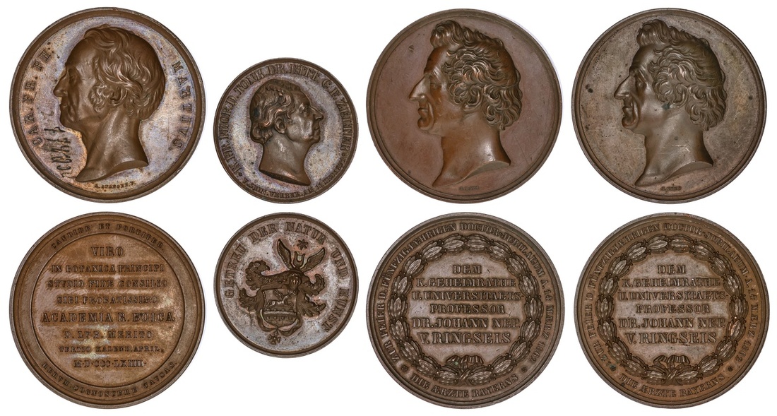 Germany. Quartet of 19th Century AE Personal Medals: Johann Nepomuk v. Ringseis, on his 50th Anniversary as a Doctor, 1862 (2). 48mm. By Ries. Physician's head left / Legend within wreath; Carl Friedrich Zelter, 1831. 36mm. By Facius. Head of the composer and teacher right / Helmed Pegasus Arms; Carl Friedrich Philipp v. Martius. 48mm. By Stanger. Head left of the botanist and explorer / Legend within central circle. Old inked inventory number obverse field. VF-EF. (4)