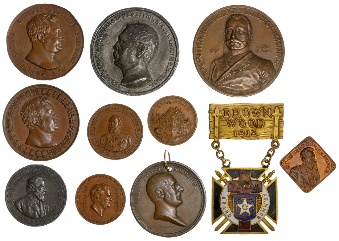 Germany. Lot of 19th-early 20th Century Medals. Generally Bronze, unless otherwise indicated: Saxe-Weimar-Eisenach. 50th Anniversary of Karl August's Reign, 1825. By Brandt. 41mm. Zodiac reverse, On the Death of Karl August, 1828. By Loos. Edge bruise and mount removed from edge; Dr. Georg Ritter v. Schuh, 1898. 50mm; Ernst Heinrich v. Stephan Postmaster of Germany. Uniface, White Metal, 33mm; Ernst v. Bibra, Uniface, White Metal, 49mm; small medallets - Nicholaus Friedrich Peter Grandduke of Oldenburg 60th Birthday 1887, 30mm; Death of Richard Wagner, 1883 by Lauer, 27mm; Albrecht Dürer Haus, 27mm; Numismatist C.F. Gebert, 1914, diamond-shape, 24mm; also John Philip Kemble. 41mm. By Warwick. Holed at 12:30; Texas Knights Templar Brownwood 1912 Badge. Fine-EF. (11)