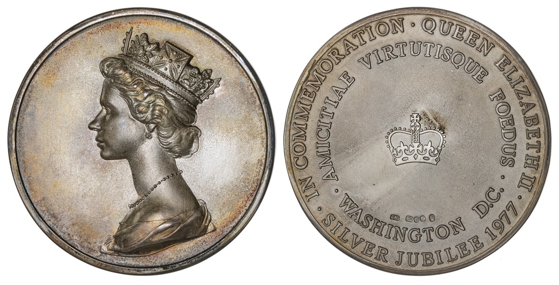 Great Britain. Elizabeth II (1952-2002). Silver Jubilee, 1977. Medal. Silver (.925), 60mm. By A. Machin. High-relief bust of Elizabeth II left; rev. Crown at center, legend in two lines around, London and Jubilee year hallmarks. 1,000 medals struck, produced by the Smithsonian Institution, Washington, D.C. Eimer 2134. In original case. Toned. Uncirculated.