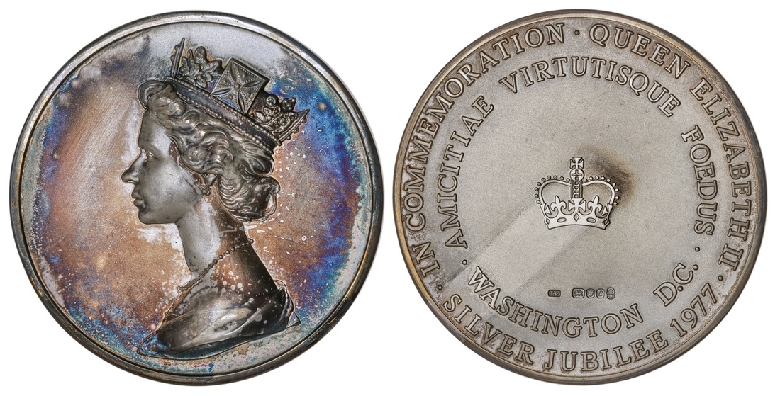 Great Britain. Elizabeth II (1952-2002). Silver Jubilee, 1977. Medal. Silver (.925), 60mm. By A. Machin. High-relief bust of Elizabeth II left; rev. Crown at center, legend in two lines around, London and Jubilee year hallmarks. 1,000 medals struck, produced by the Smithsonian Institution, Washington, D.C. Eimer 2134. In original case. Dark obverse toning. Uncirculated.