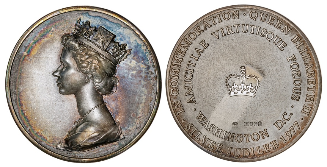 Great Britain. Elizabeth II (1952-2002). Silver Jubilee, 1977. Medal. Silver (.925), 60mm. By A. Machin. High-relief bust of Elizabeth II left; rev. Crown at center, legend in two lines around, London and Jubilee year hallmarks. 1,000 medals struck, produced by the Smithsonian Institution, Washington, D.C. Eimer 2134. In original case. Peripheral rainbow toning. Uncirculated.