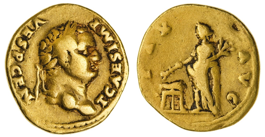 Roman Imperial. Titus, as Caesar (AD 69-79). AV Aureus. Rome, AD 73. 7.02 gms. T CAES IMP VESP CEN, Laureate head right, rev. PAX AVG, pax, draped standing left, extending winged caduceus over follis lying on tripod before. RIC 551 (Vespasian) Calicó 744. Small dig/press mark upper reverse. Good Fine.
