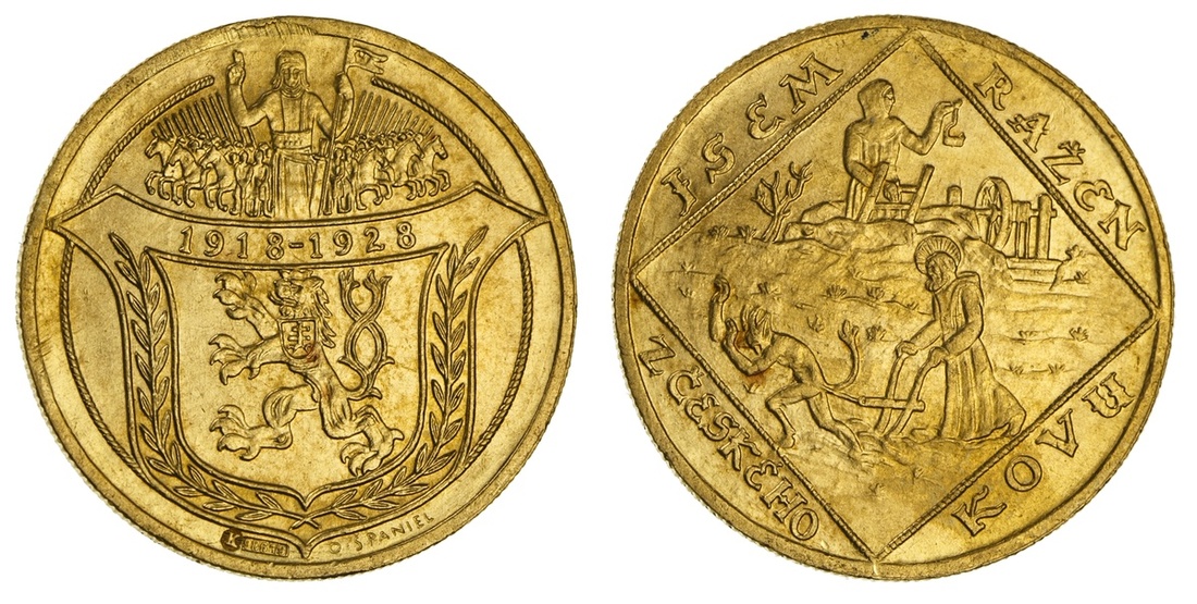 Czechoslovakia. 4 Dukáty, 1928. Kremnica. 10th Anniversary of the Republic. By Otakar Spaniel. Saint driving plow drawn by the devil left, miner, holding a oil lamp, emerging from the ground on a ladder, all within a beaded diamond, rev. Arms, flanked by laurel branches, and topped by St. Wencelas holding banner, a mounted army behind him. Fr. 6, X M4, Novotny 1.a. Brilliant Uncirculated. Ex Coin Galleries Sale, Nov. 5, 1997, lot 858.