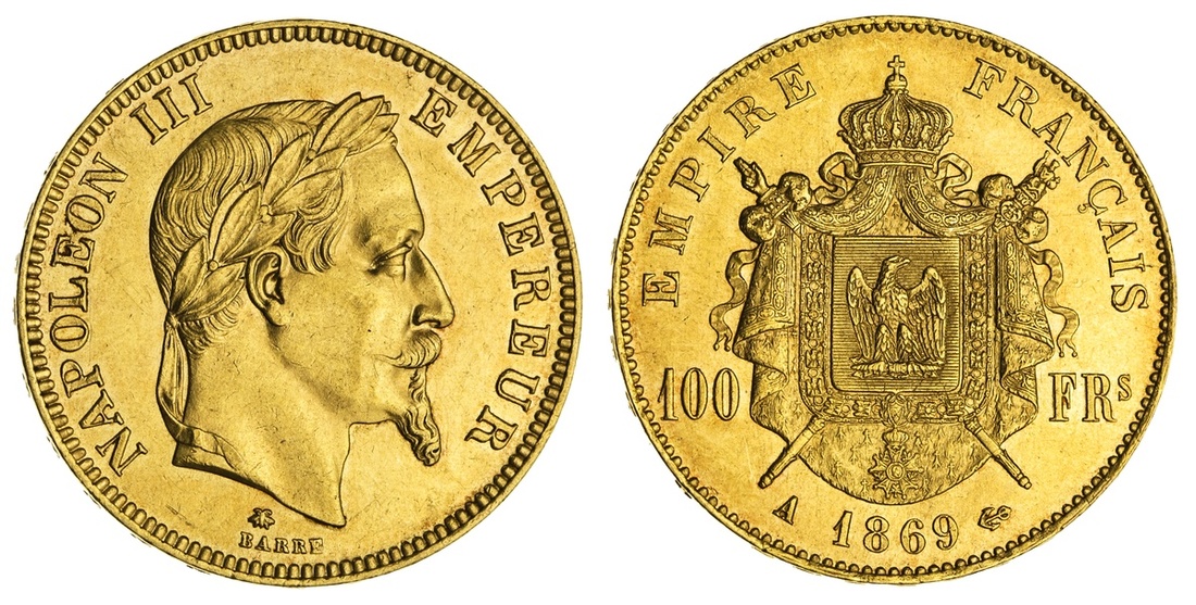 France. Napoleon III (1852-1870). 100 Francs, 1869 A. Paris. Laureate head right, rev. Crowned and mantled Arms, crossed scepters behind. KM 802.1. 29,000 pieces struck. About Uncirculated.