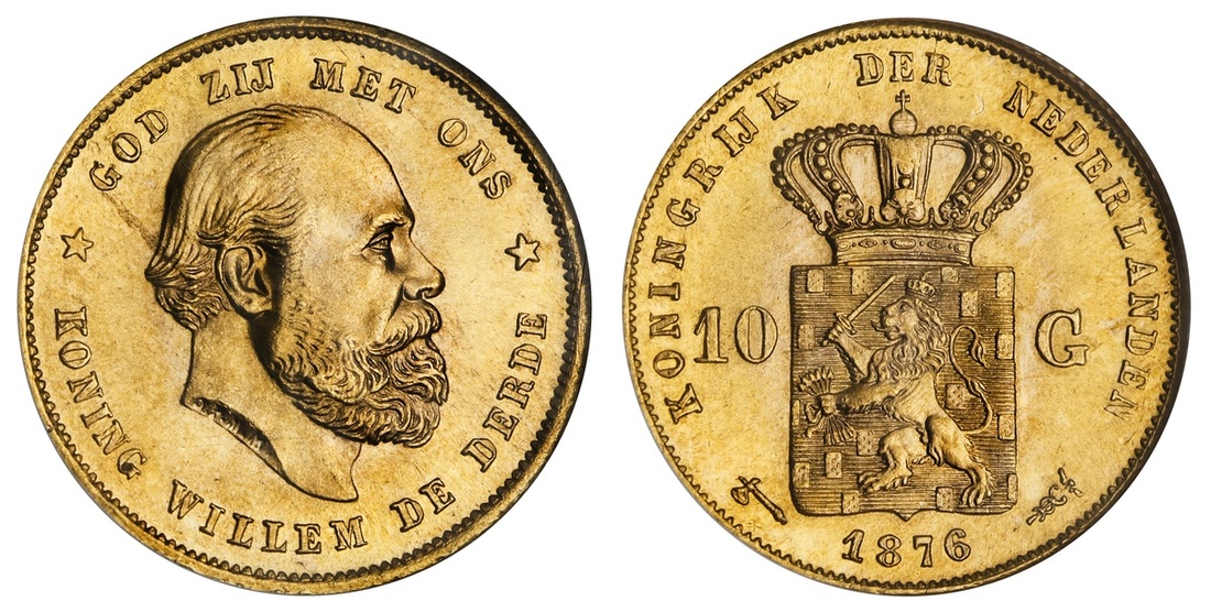 Netherlands. Willem III (1849-1890). 10 Gulden, 1876. Head right. Fr.342, KM 106. NGC MS 65. Ex Stack's Bowers, Philadelphia, August 14, 2012 (internet), lot 50240.