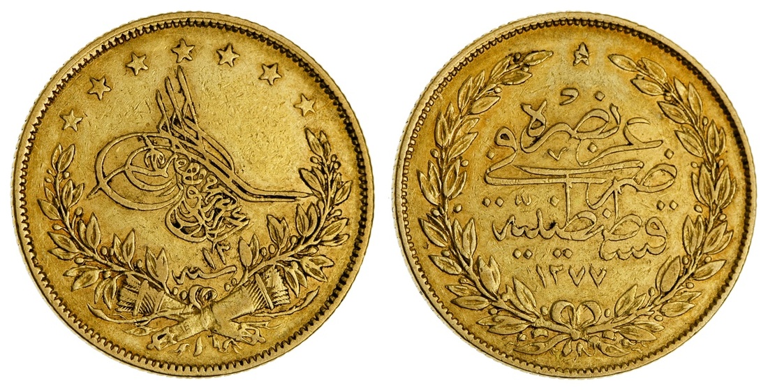Turkey. Ottoman. `Abd al-`Aziz (AH 1277-1293/ 1861-1876 AD). 100 Kurush, acs. AH 1277, year 13. Toughra, stars above, spray and crossed quivers below. KM 696. Very Fine.