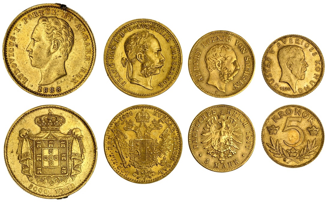 Quartet of European Gold Coins: Sweden. 5 Kroner, 1920; Portugal. 5000 Reis, 1888. Mount mark 12:00; Saxony. 5 Mark, 1877 E. Polished, jewelry wear; and Austria. Ducat, 1899. Obverse hairlines. VF-EF. (4)